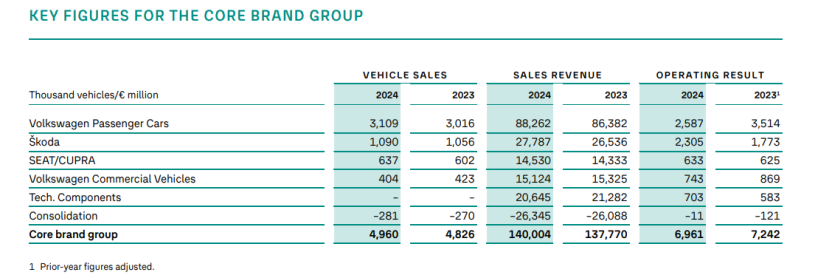 其中,大众品牌作为核心品牌中的核心,2024年销售新车310.9万辆,营业收入882.6亿欧元,销售利润为25.87亿欧元。另外,斯柯达品牌实现了23.05亿欧元的盈利,完成了“用大众三分之一的销量,实现了几乎相同的利润规模”的壮举,这一点与其在中国市场的表现大相径庭。