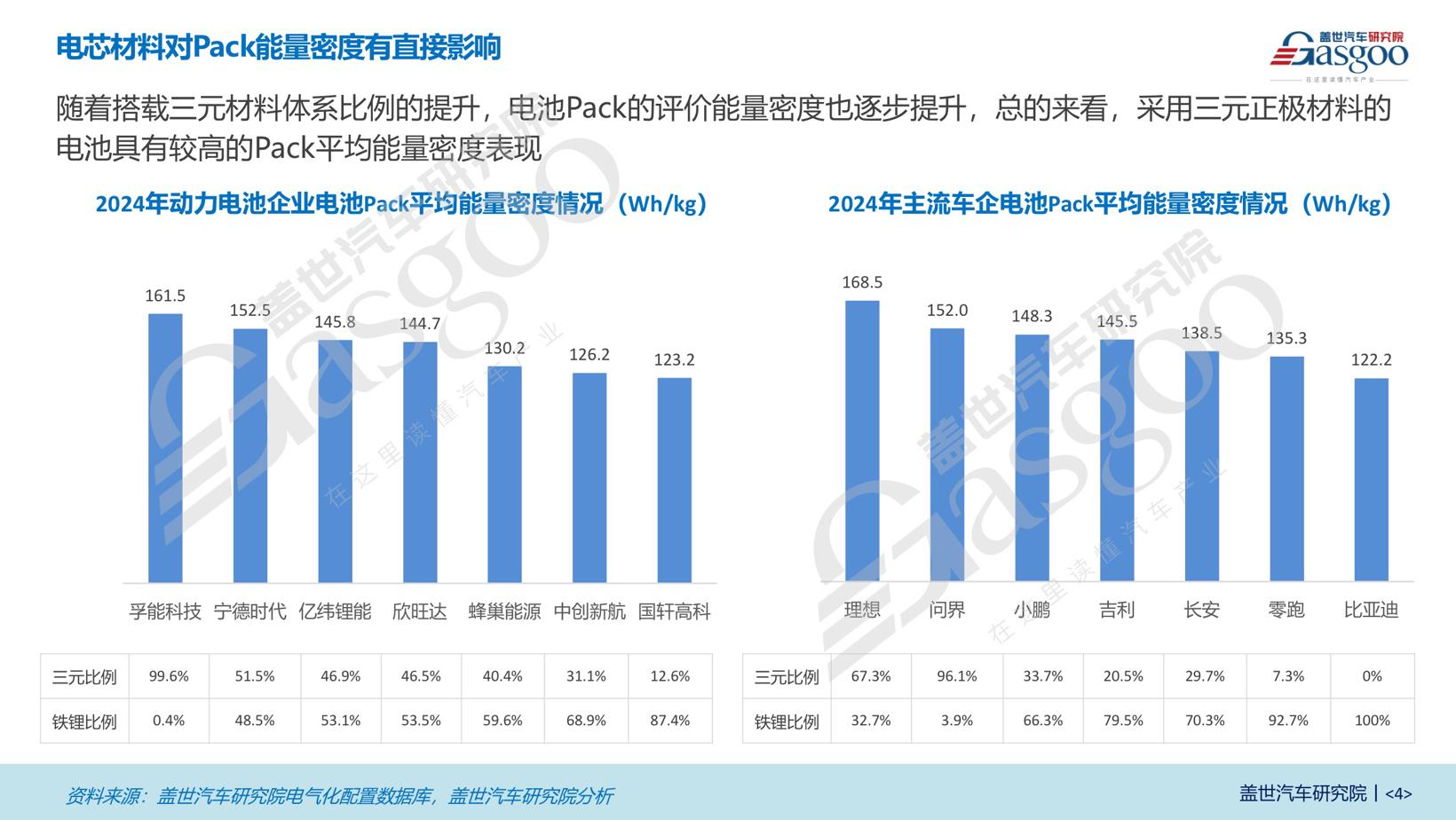 电芯材料直接影响Pack能量密度,三元比例与Pack能量密度呈显著正相关。2024年,动力电池企业中,电池Pack平均能量密度随三元比例升高而依次提升,其中孚能科技的Pack平均能量密度达到161.5Wh/kg,三元比例99.6%。