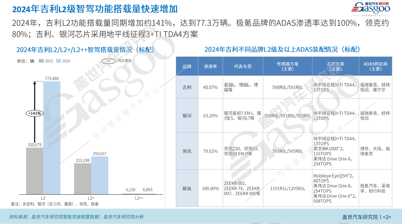 2024年,吉利汽车在L2级智能驾驶领域实现爆发式突破,全年搭载量飙升至77.3万辆,较2023年的32.1万辆激增141%。这一飞跃不仅体现了规模的增长,更彰显出集团多品牌协同战略的技术渗透力。