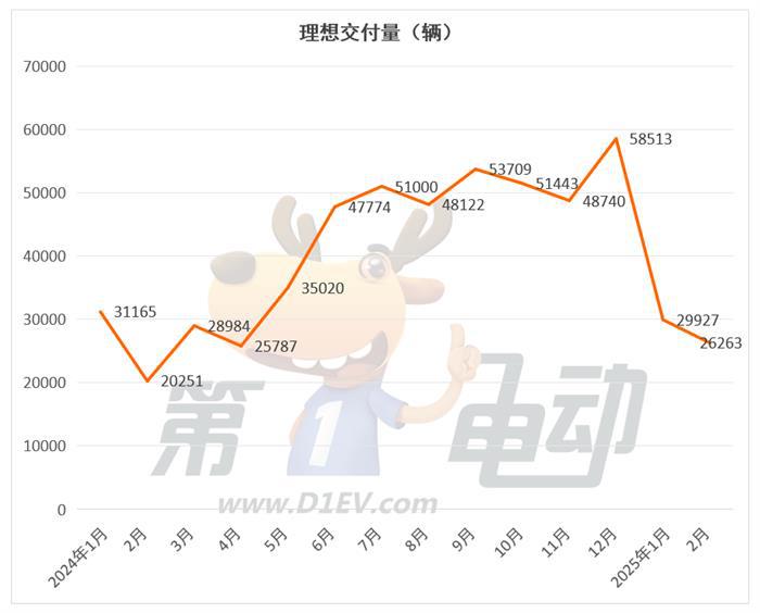 2月,理想汽车交付新车26,263辆,同比增长29.7%,但环比下滑超12%。为了及时挽救市场份额,理想于2月28日推出限时购车优惠政策,2025年2月28日至3月31日(含)订购理想L系列,可至高立省3.8万元,其中尾款至高立减1.6万元,3年0息金融方案最高节省利息2.2万元。