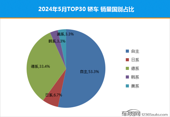 从榜单车型的国别占比统计中可以发现,德系品牌占比有所提升,较4月份提高了3.4个百分点。相比之下,日系品牌占比大幅缩水,降至年内的最低点。美系品牌本月重返榜单,但仅有1款车型入榜。