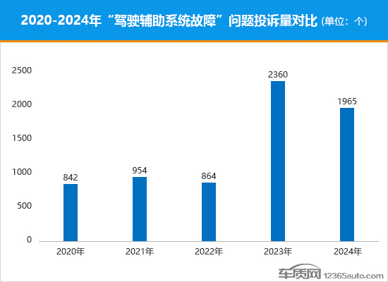 智驾系统涉及多个复杂的技术领域,包括传感器技术、数据处理、算法决策等。这些技术的不成熟或缺陷可能导致系统故障频发。根据车质网投诉数据显示,自2020年以来,“驾驶辅助系统故障”投诉量始终处于较高水平,并且2023年和2024年均超过千宗,反映出当前智驾功能仍存在局限性。