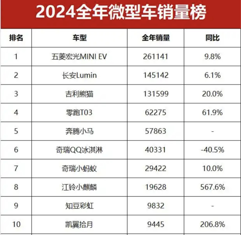 数据显示,2024年全年我国纯电微型车市场累计零售销量达到124.8万辆,同比大幅增长32%。光是全年零售销量超过12万辆(月均销量破万辆)的微型车就有三款车型,它们分别是宏光MINIEV的26.1万辆,长安Lumin的14.5万辆;吉利熊猫的13.2万辆,且三者的表现也都是同比大幅增长的状态。