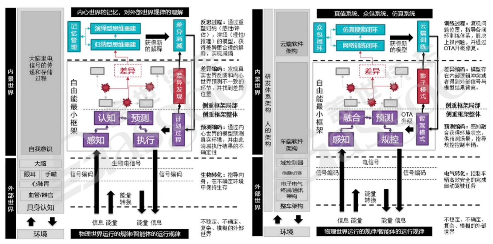 人类的思维过程存在两种逻辑:感知认知、预测执行的低功耗逻辑,以及与之相对的高能耗逻辑。低功耗逻辑如同智能驾驶中车端处理的核心部分,每时每刻都在运行,功耗低、延时低。在这一过程中,感知的本质是对外部冗余环境信息进行压缩,融合是在内部世界形成对外部信息的唯一概念整合,预测是基于内部模型对未来不确定性的判断,执行则是在不确定性预测下制定并实施确定性的行为计划。